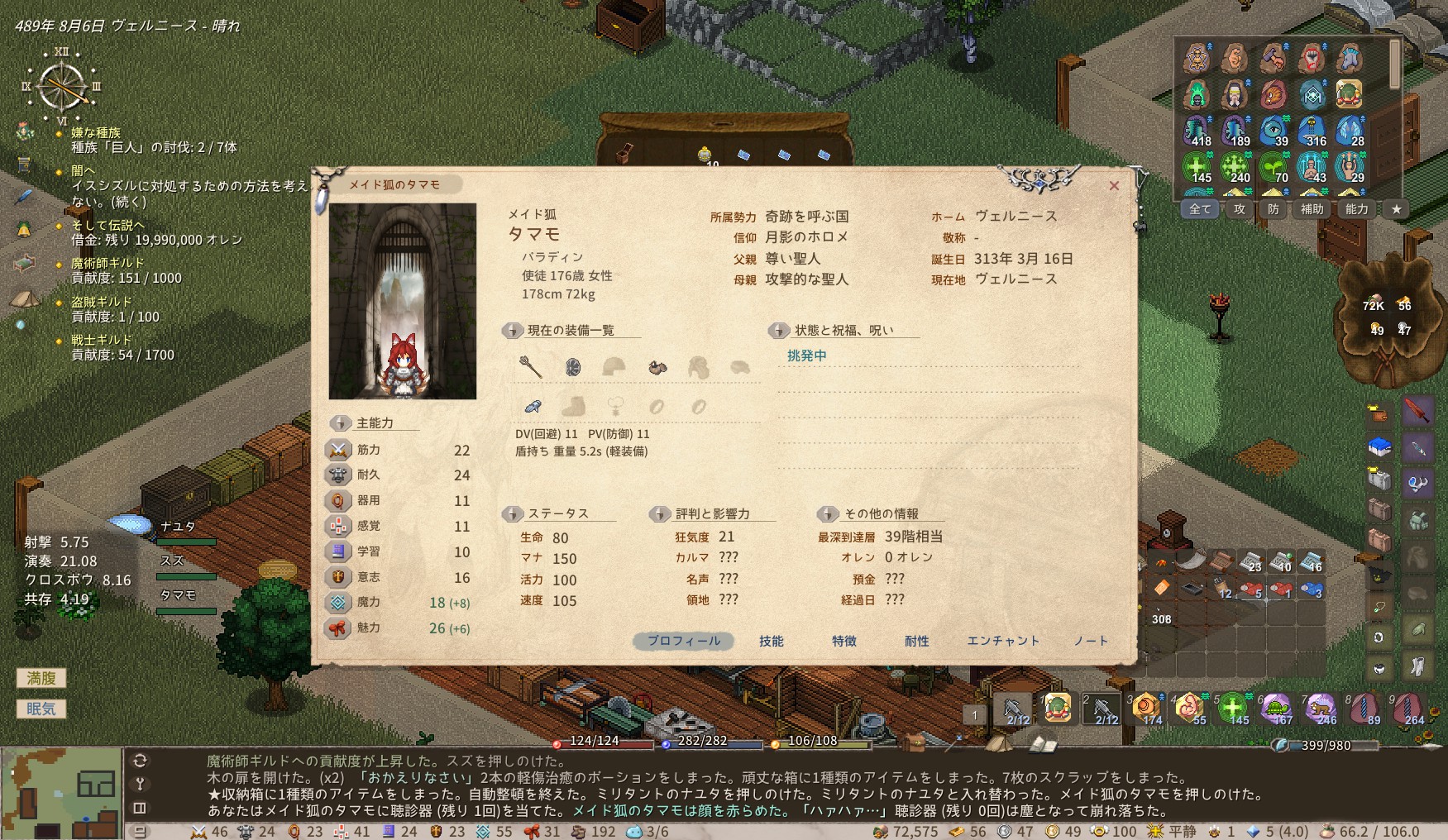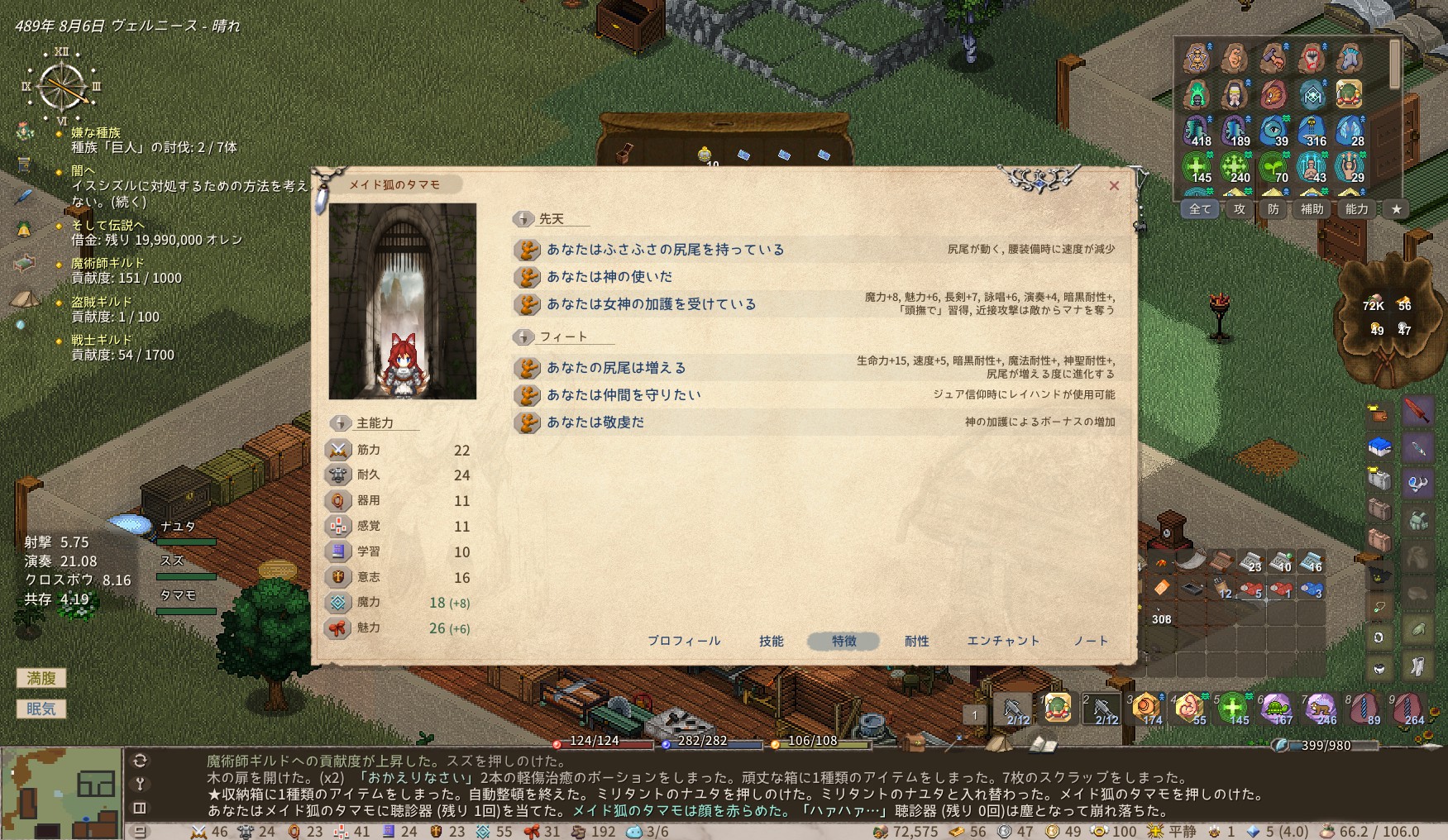 そしてとにかくお供え物の稼ぎやすさワーストに入るホロメママの方ですが、ネフィア潜りで集まる杖と長剣を集めて捧げまくった結果、使徒である『メイド狐』をいただきました。その名の通りメイド服を着たキツネのお姉さんです。
