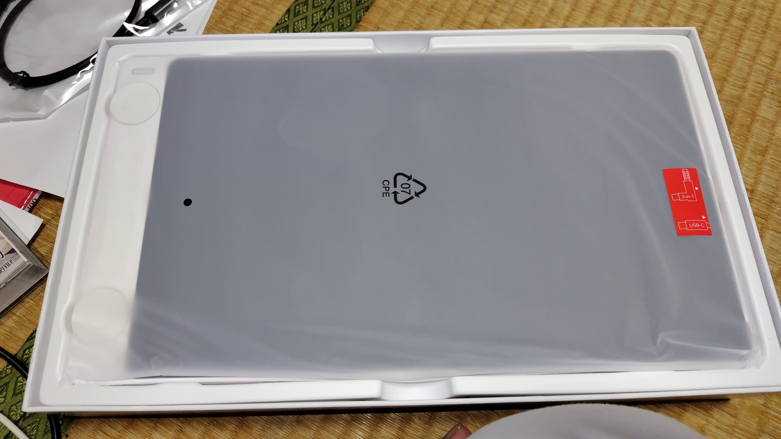 付属物はこんな感じ。1枚目左上のc-cケーブルはオールインワンのやつですね。追加料金かかったはずですが、購入時のオプションで買えます。ただ私のパソコンにcさせるところはありません。残念ながら。ただ、このケーブルのおかげでスマホとも繋げられる……のかな? パソコンが買えない、という人には嬉しいかもしれませんね。前液タブとの大きな違いはケーブル。前はコンセント付きケーブルでしたが、今回はUSBA端子にパソコンなり電源タップなりをぶっ刺して使うタイプになります。上に入ってる両側が赤いケーブルは電源ケーブル用の延長コードです。コンセント遠い環境でも安心。