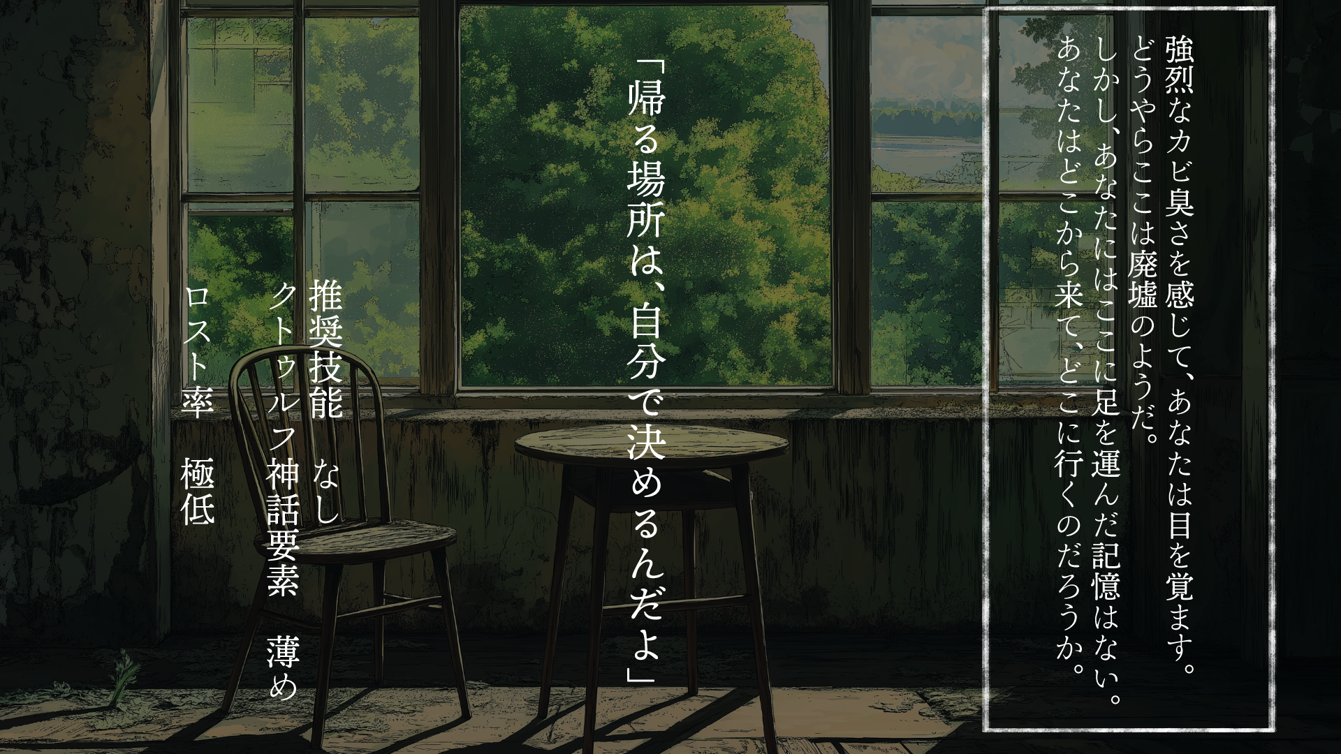 NPCのイラストを描いてからのアップとなりそうでしたが、本文だけ先に公開になる可能性が十二分にあります。ご了承ください。お絵かき、MPゴリッといくので……。Midjourneyで作成した廃墟背景を同梱しますのでセッションにお役立てください。廃墟は性質上写真素材が少なく、描くのにもかなり苦労するので。
