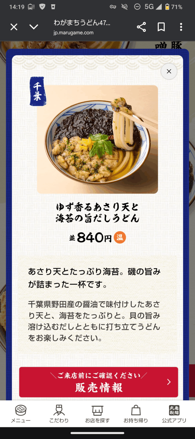 で、今年も『わがまちうどん』の名前で期間限定開催しています。今回はつけ汁ではなく『うどん全体』を対象にしている……と。今回の千葉県のメニューはどんな感じかな?