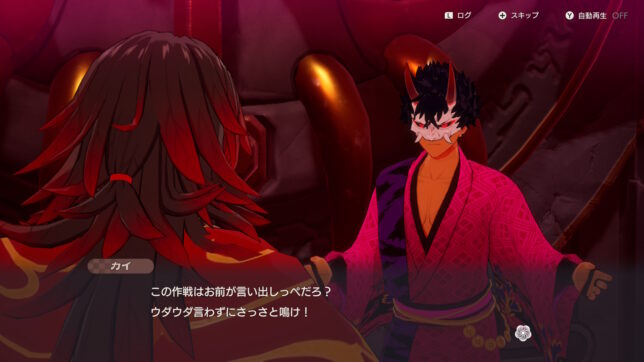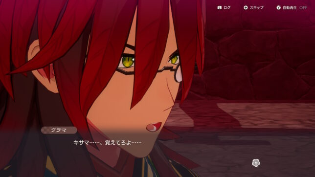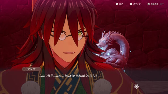 また、本作はキャラ同士の掛け合いがすごい面白いなと思いました。中盤のスクショで申し訳ないのですが、イヌトリ連れて来いという指示でなんか既にチェックついてんなと思い「これパスできんの?」と思ったらマジでパスできちゃった時のやつです。クラマとカイは古くから付き合いがあるのか、一緒にパーティに入れているとお互いに軽口(けなしあいかもしれん)叩き合う姿が見られます。