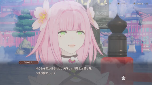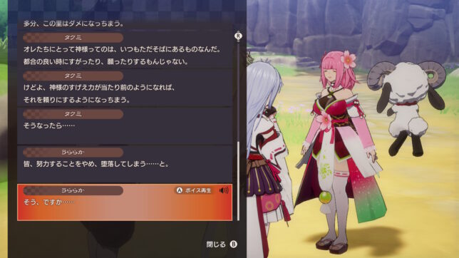 加えて、里の住人達は『そばに神様がいる』という前提で暮らしているので、人と神の距離がかなり近いなとも感じました。みんな神様として尊敬しつつご近所さん感覚で付き合っておる。でも、うららかとのイベントであったこのタクミの言葉にはかなりの重みがあるなとも思います。特にうららかは困っている人がいたら何でもかんでも十まで手助けしてしまうので、タクミが言う通りの線引きや距離感って大事だなと思いました。『人と神』というテーマのいい所を色々吸えるゲームでもあると思います。