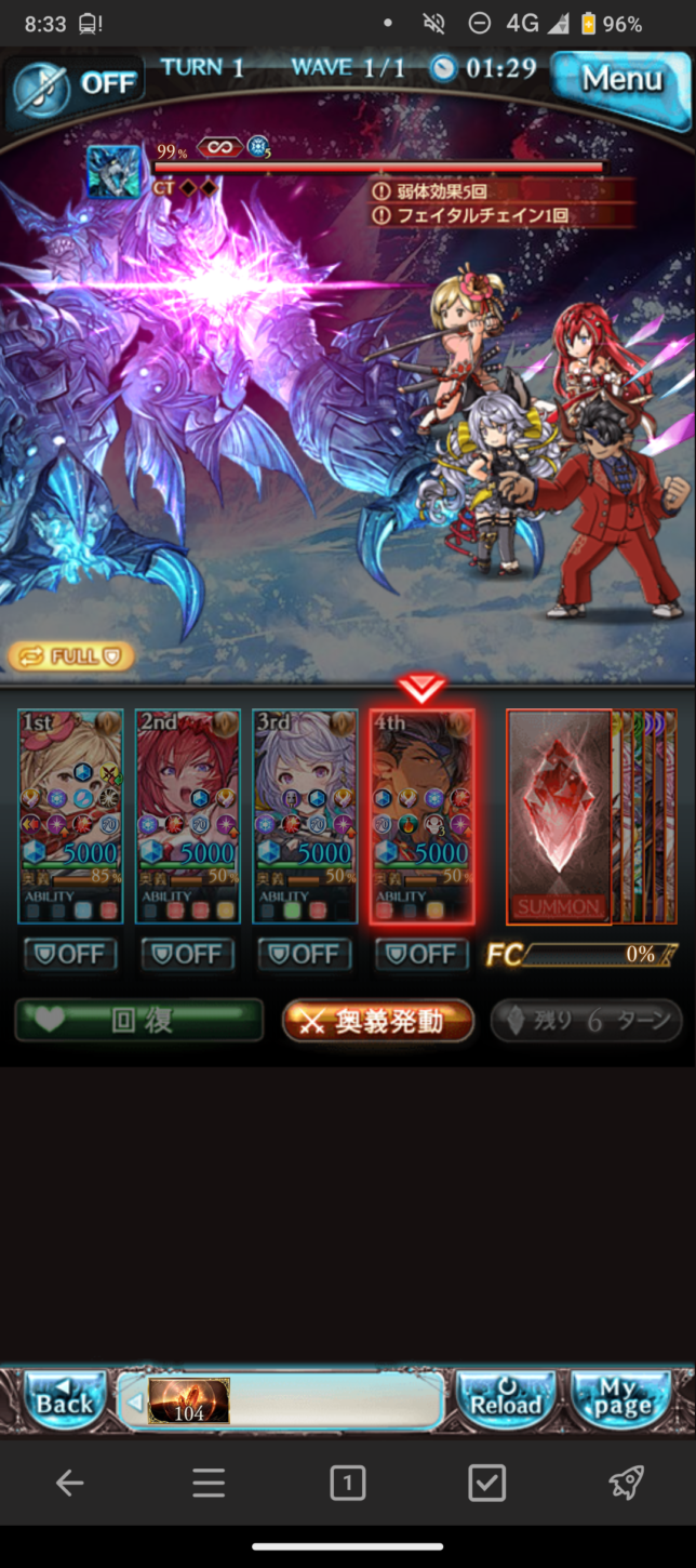 そんな中ねじ込まれたのがエクスコキュートス神滅戦。今回の開催で180~200、エンドレスバトルが実装され、合わせて六道神器の方の5凸も実装。5凸には180以上から落ちるアイテムが必要なので180に行ってみたら開幕から1枚目の惨事といった感じです。初手FCとか無理でしょこれ。